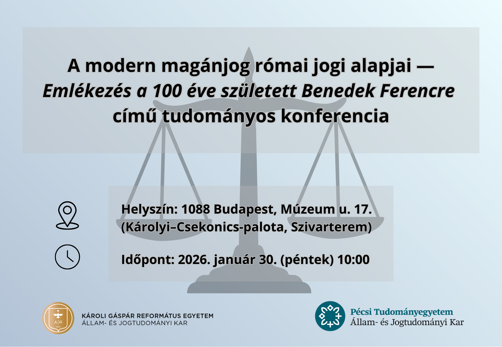 A Károli Gáspár Református Egyetem Állam- és Jogtudományi Kara és a Pécsi Tudományegyetem Állam- és Jogtudományi Kara közös szervezésében 2026. január 30-án (pénteken) tudományos konferenciára kerül sor „A modern magánjog római jogi alapjai – Emlékezés a 100 éve született Benedek Ferencre” címmel.